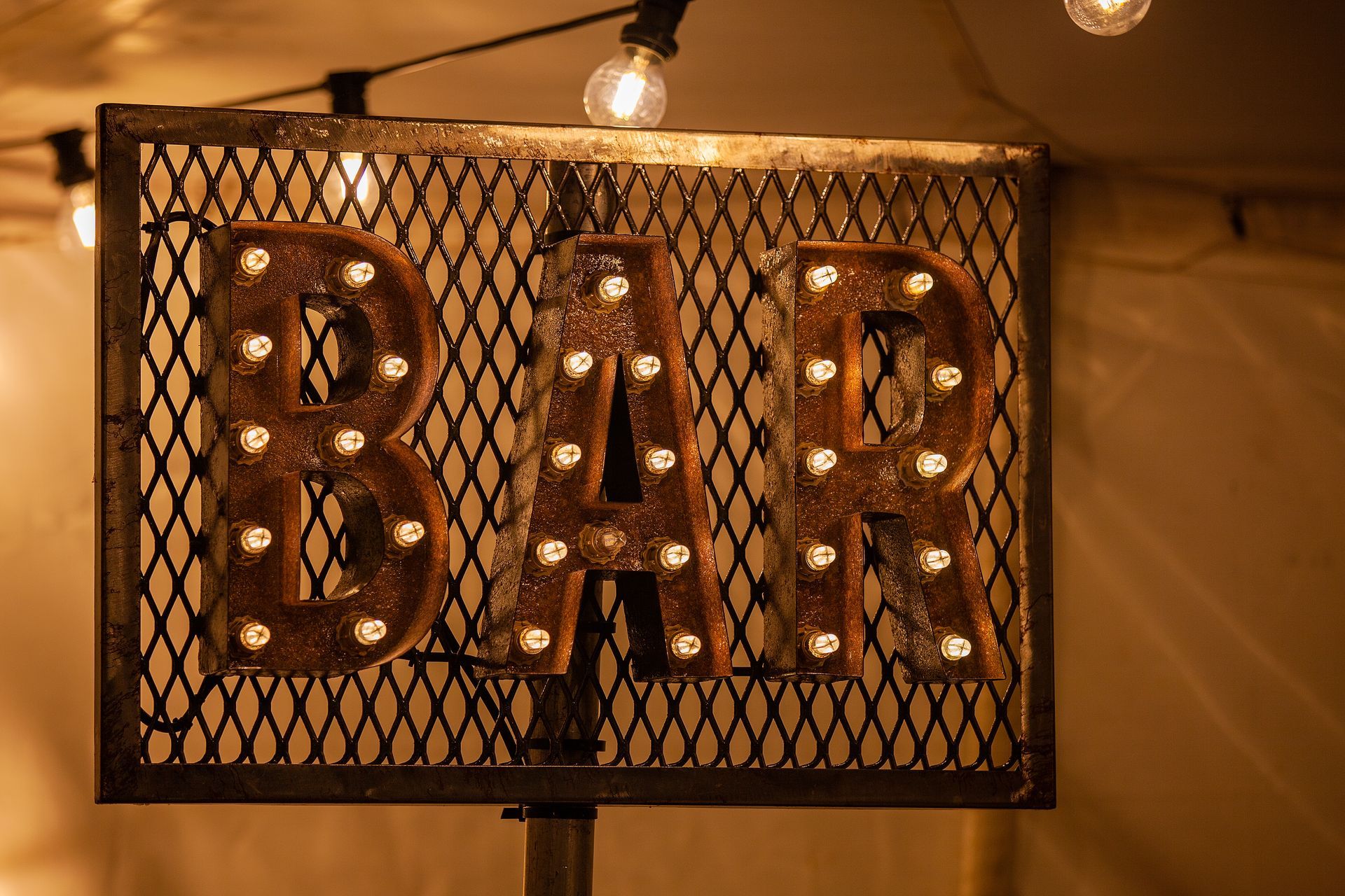 A bar inside a tent. People interact at the counter. String lights hang above.